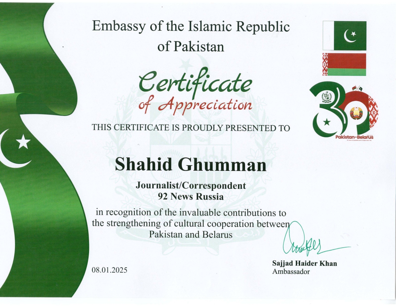 ماسکو(وائس آف رشیا) روس میں پاکستانی سینئر جرنلسٹ شاہد گھمن کو اعلیٰ صحافتی خدمات کے اعتراف میں سفارت خانہ پاکستان بیلاروس کی جانب سے تعریفی سرٹیفیکیٹ دیا گیا. سفیر پاکستان سجاد حیدر خان جو اہنی بیلاروس میں تعیناتی کی مدت مکمل کرکے پاکستان واپس چلے گئے ہیں انہوں نے اپنے زیردستخطی تعریفی سرٹیفیکیٹ نمائندہ 92نیوز شاہد گھمن کو سفارت خانہ پاکستان بیلاروس کی جانب سے جاری کیا.