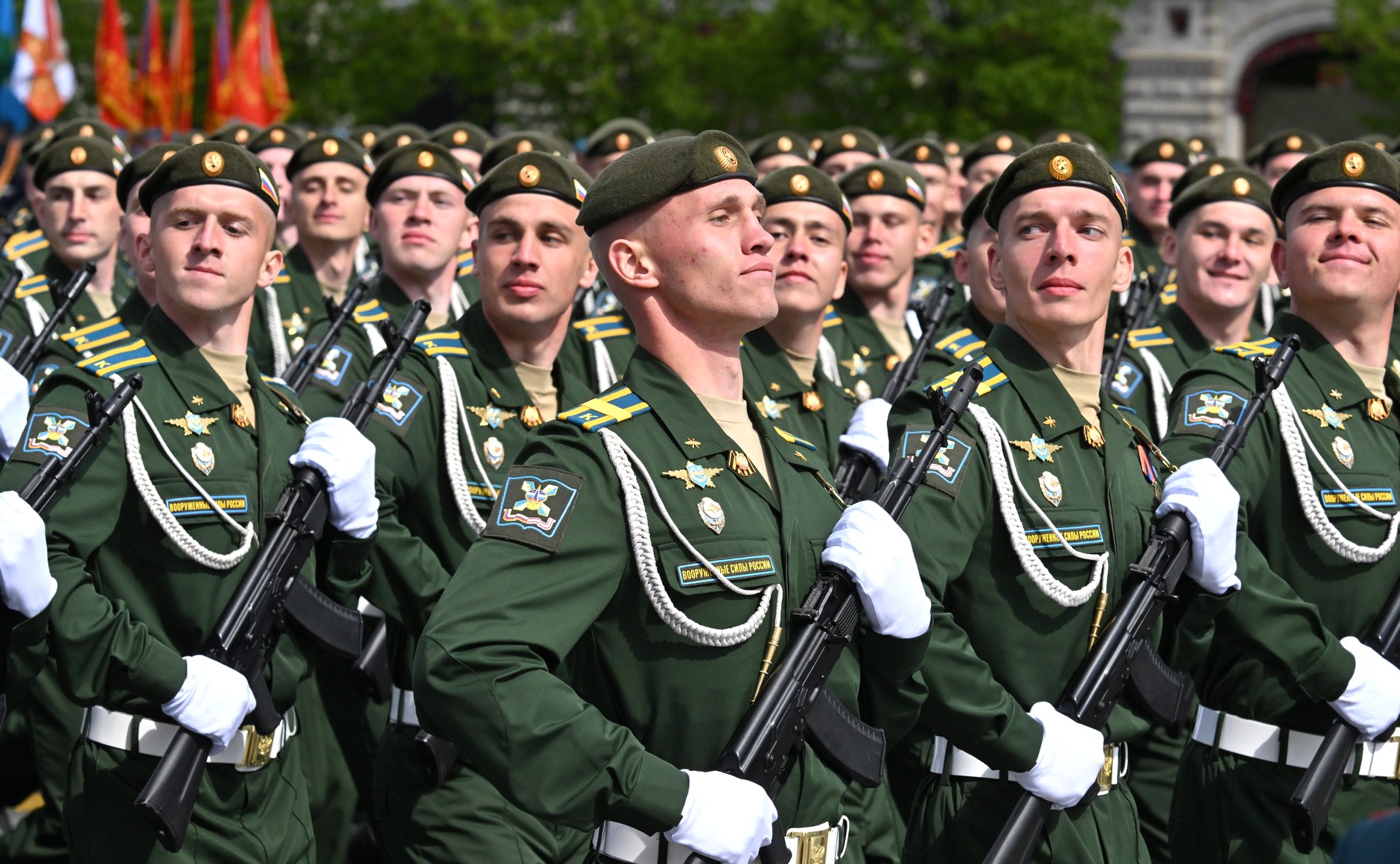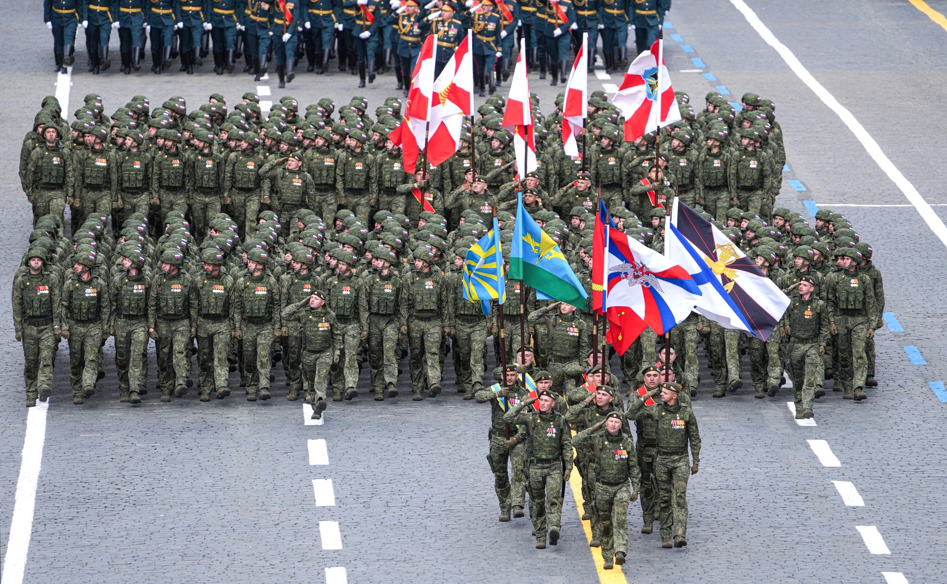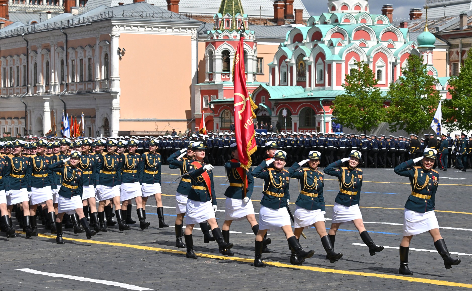 ریڈ اسکوائر پر مارچ کرنے والے کالم میں 55 پریڈ یونٹس شامل تھے: ساڑھے گیارہ ہزار سے زیادہ فوجی، جن میں سے ڈیڑھ ہزار سے زیادہ خصوصی فوجی آپریشن میں شریک تھے۔ وکٹری پریڈ میں آذربائیجان، بیلاروس، قازقستان، کرغزستان، تاجکستان، ترکمانستان، ازبکستان، ویت نام، مصر، چین، لاؤس، منگولیا اور میانمار کے فوجی جوانوں نے بھی شرکت کی۔جبکہ بکتر بند گاڑیاں، جدید ٹیکنالوجی سے آراستہ فوجی سازوسامان کے ساتھ ساتھ جدید میزائل سسٹم بھی خصوصی پریڈ میں شریک ہوئے۔۔