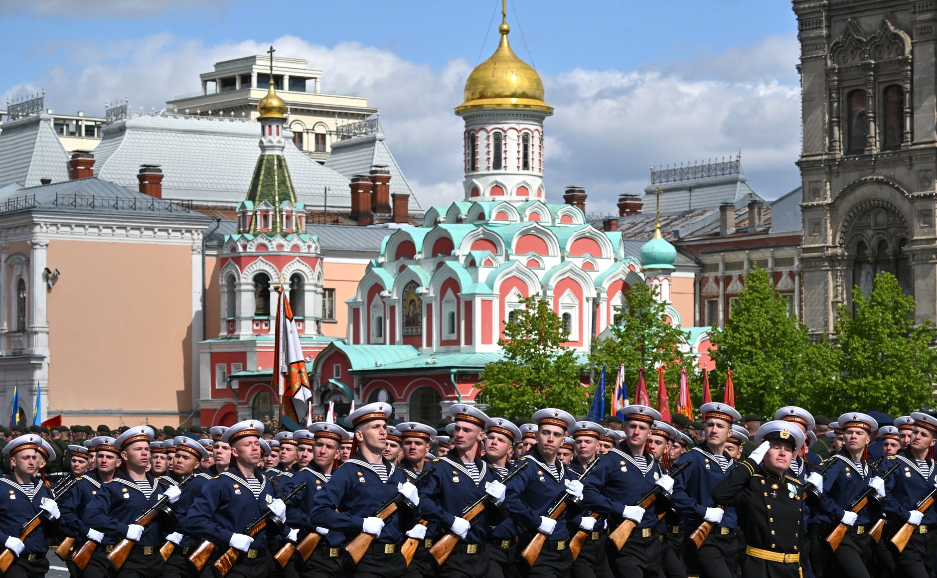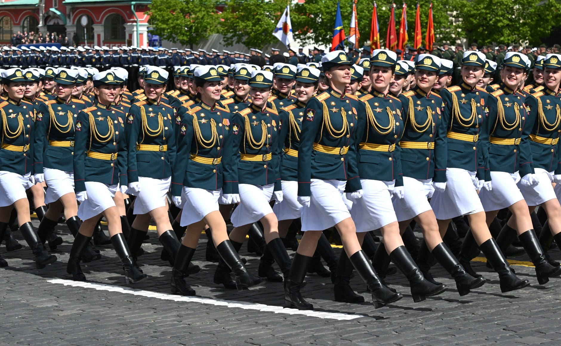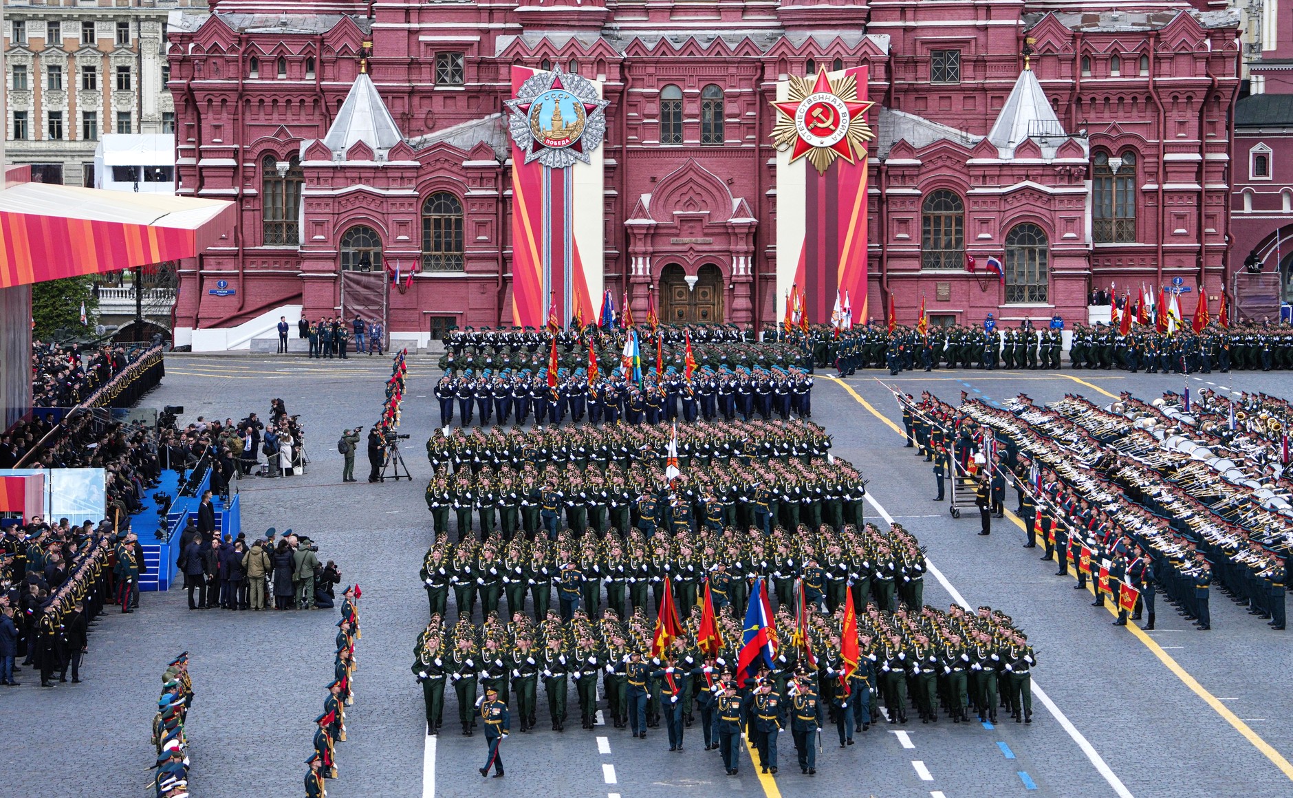 ریڈ اسکوائر پر مارچ کرنے والے کالم میں 55 پریڈ یونٹس شامل تھے: ساڑھے گیارہ ہزار سے زیادہ فوجی، جن میں سے ڈیڑھ ہزار سے زیادہ خصوصی فوجی آپریشن میں شریک تھے۔ وکٹری پریڈ میں آذربائیجان، بیلاروس، قازقستان، کرغزستان، تاجکستان، ترکمانستان، ازبکستان، ویت نام، مصر، چین، لاؤس، منگولیا اور میانمار کے فوجی جوانوں نے بھی شرکت کی۔جبکہ بکتر بند گاڑیاں، جدید ٹیکنالوجی سے آراستہ فوجی سازوسامان کے ساتھ ساتھ جدید میزائل سسٹم بھی خصوصی پریڈ میں شریک ہوئے۔۔