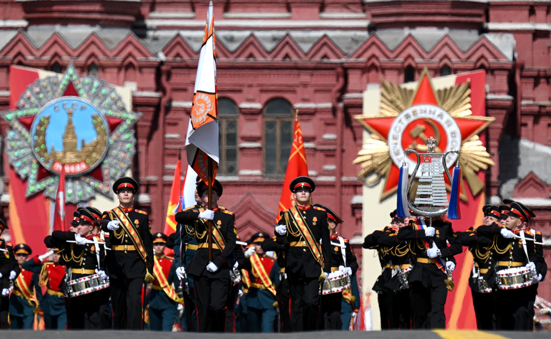 پریڈ کے تاریخی حصے میں روسی فوجی سویت دور کی وردیوں میں ملبوس تھے، اور اس دور کے فوجی جھنڈے اور اسلحہ اٹھائے ہوئے تھے، جو فاشزم کے خلاف مزاحمت کے یادگار مناظر کو تازہ کر رہے تھے۔