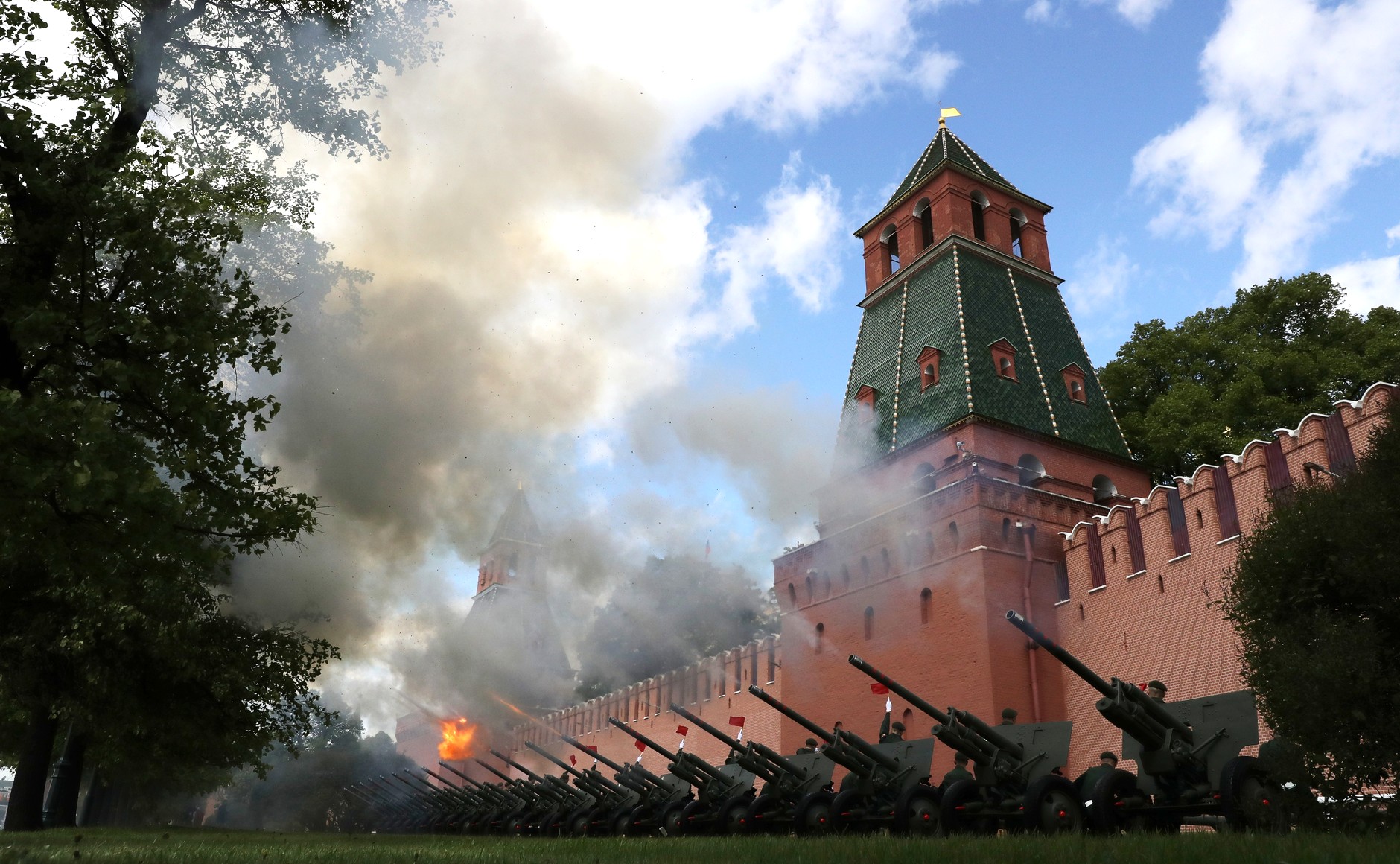 صدر پوتن کے خطاب کے بعد عظیم الشان فوجی پریڈ کا آغاز ہوا، جس میں روس کا قومی ترانہ بجایا گیا اور توپوں کی سلامی دی گئی۔ مسلح افواج کے دستے منظم انداز میں ریڈ اسکوائر سے مارچ کرتے ہوئے گزرے۔