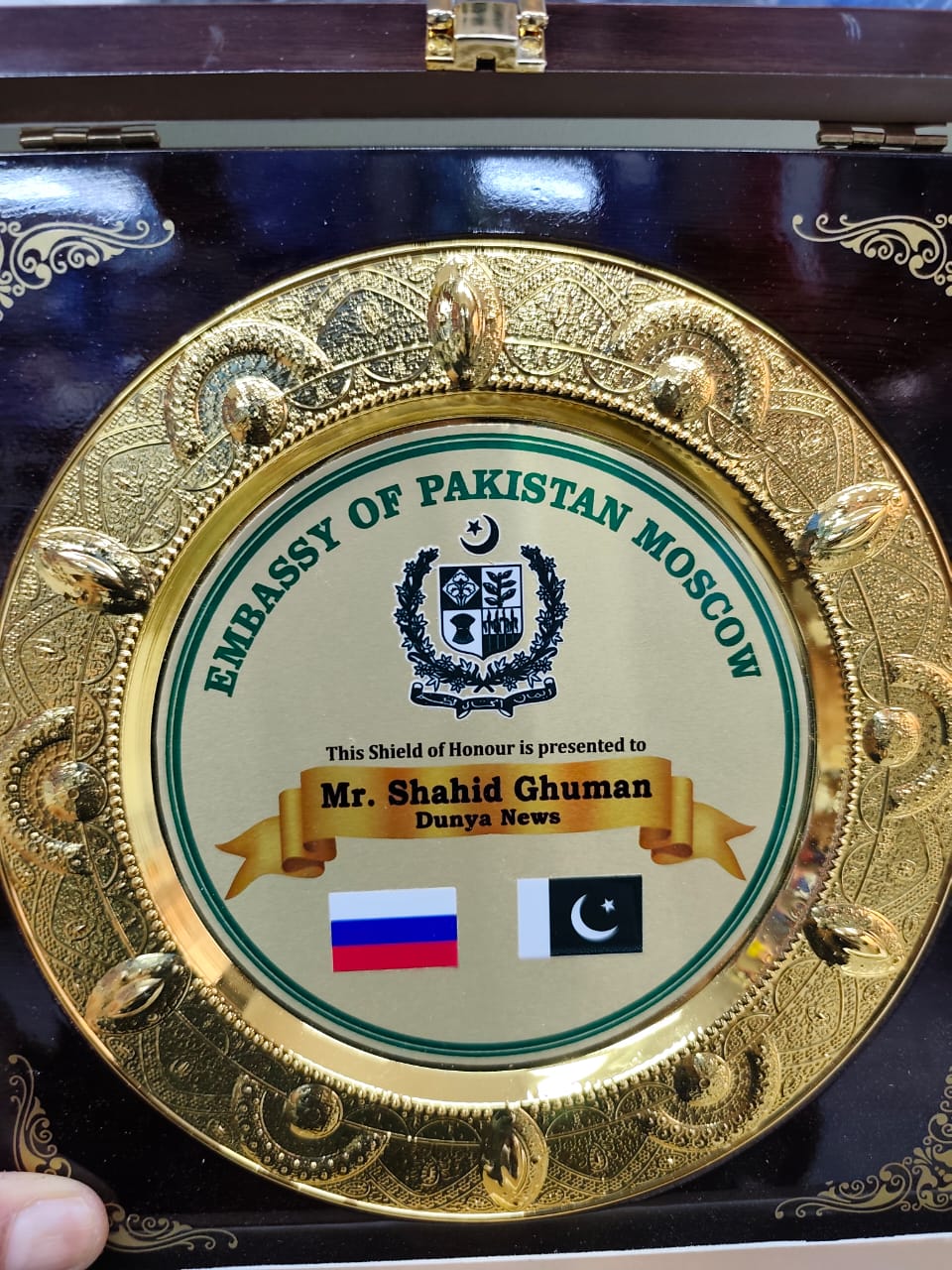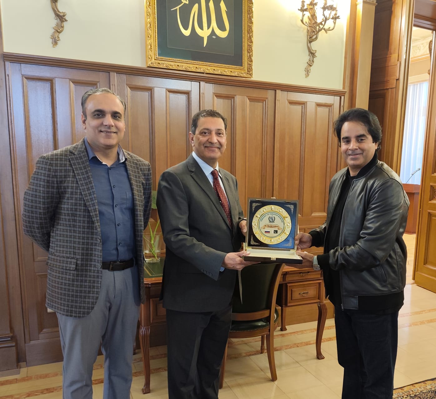 ماسکو(وائس آف رشیا) ماسکو میں پاکستان کے سفیر محمد خالد جمالی نے پاکستانی صحافی و نمائندہ دنیا نیوز روس شاہد گھمن کو ان کی اعلیٰ صحافتی خدمات کے اعتراف میں ایک اعزازی شیلڈ پیش کی۔ اس موقع پر قونصلر رانا محمد خالد ضیا بھی موجود تھے۔ یہ اعزاز نہ صرف ان کی محنت اور لگن کا اعتراف ہے بلکہ روس میں پاکستانی صحافت کے فروغ میں ان کے کردار کی گواہی بھی ہے۔