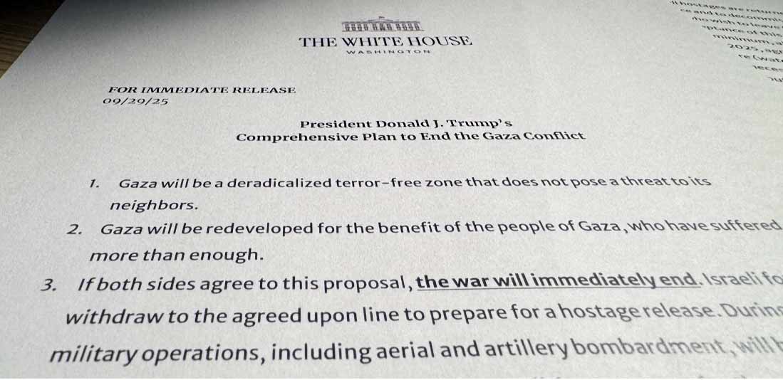 غزہ میں عارضی بین الاقوامی سکیورٹی فورس تعینات کی جائے گی، ٹرمپ اقتصادی ترقیاتی منصوبے کے تحت غزہ کی تعمیر نو ہوگی، مستقبل میں غزہ کا کنٹرول سنبھالنے کیلئے فلسطینی اتھارٹی میں اصلاحات کی جائیں گی۔