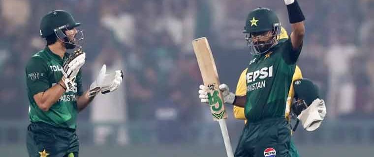 ہدف کے تعاقب میں پاکستان کا آغاز اچھا نہ تھا، قومی ٹیم کی پہلی وکٹ8 رنز پر گری جب صائم ایوب بغیر کوئی رنز بنائے پویلین لوٹ گئے، بعدازاں سلمان علی آغا اور بابر اعظم نے شاندار کھیل پیش کیا، سلمان علی آغا نے 33رنز، بابر اعظم نے 68رنز بنائے۔