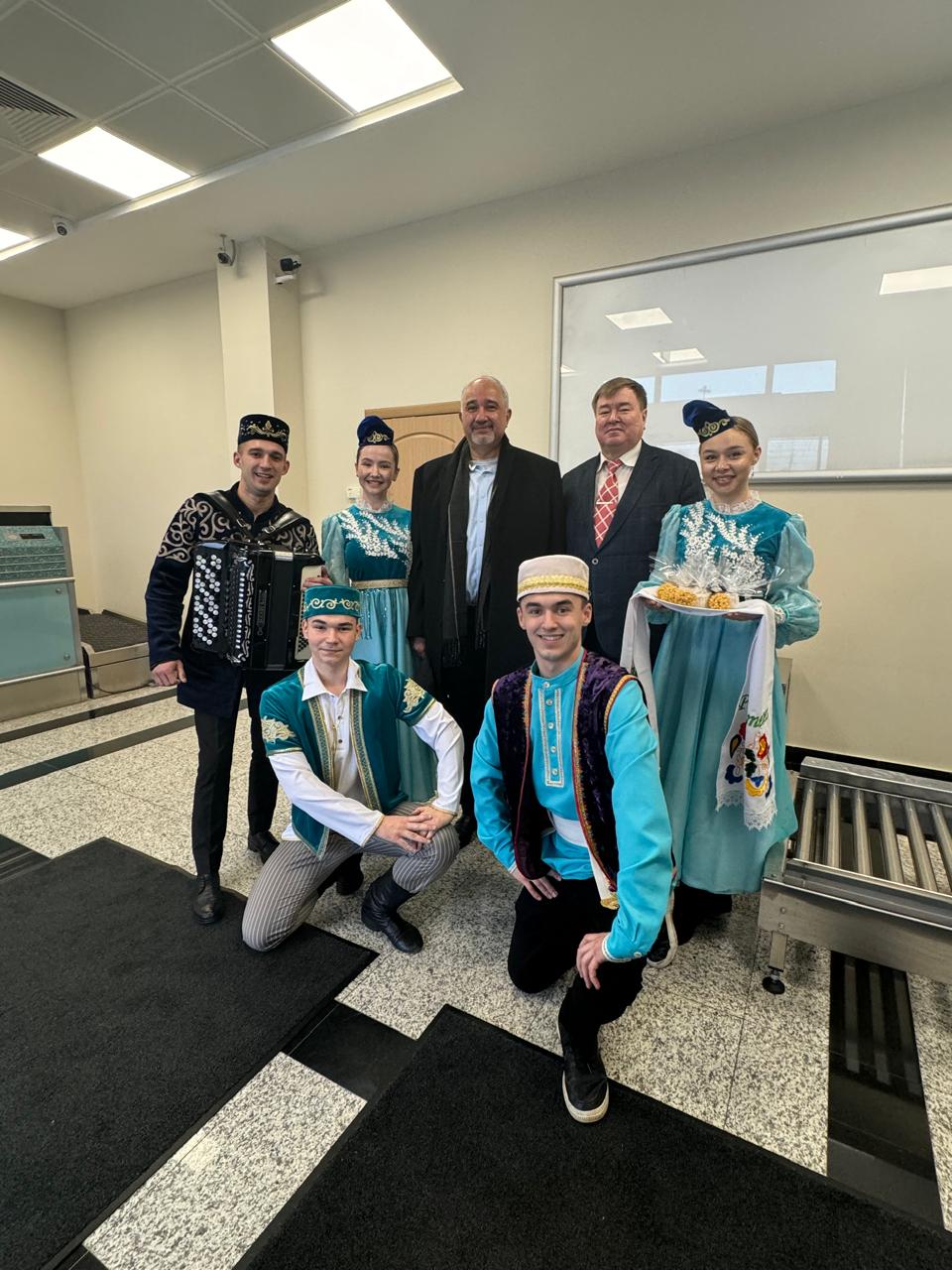 ایئرپورٹ پر ان کا خیرمقدم انٹرنیشنل فیسٹیول آف نیشنل کلچرز “روس-مشرق” کے جنرل پروڈیوسر اور آر۔ وگا پوف فاؤنڈیشن کے ڈائریکٹر رفعت فتاخوف، فیسٹیول کے منتظمین، اور تاتار نیشنل فوک اینسمبل کے اراکین نے کیا۔