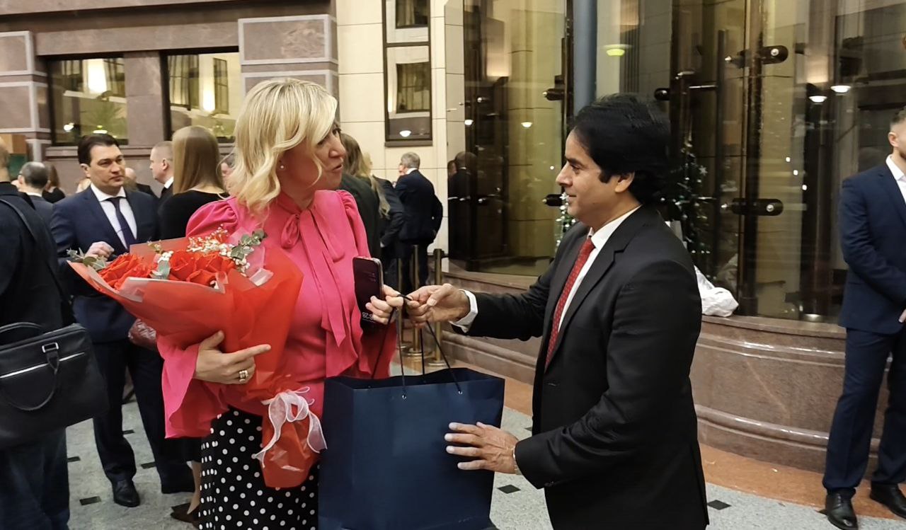 تقریب کا آغاز خوشگوار ماحول میں ہوا جہاں مہمانوں نے ماریہ زخارووا کو پھولوں کے خوبصورت گلدستے اور قیمتی یادگاری تحائف پیش کیے۔ اس موقع پرایڈیٹر”وائس آف رشیا” اور نمائدہ “دنیا نیوز” شاہد گھمن نے بھی ماریہ زخارووا کو پھولوں کا دیدہ زیب گلدستہ اور پاکستان کا روایتی تحفہ پیش کیا، جسے انہوں نے خوش دلی سے قبول کیا۔ ماریہ زاخارووا نے شاہد گھمن کا شکریہ ادا کرتے ہوئے انہیں تقریب میں خوش آمدید کہا اور پاکستان کے صحافیوں کے ساتھ پیشہ ورانہ روابط کو سراہا۔