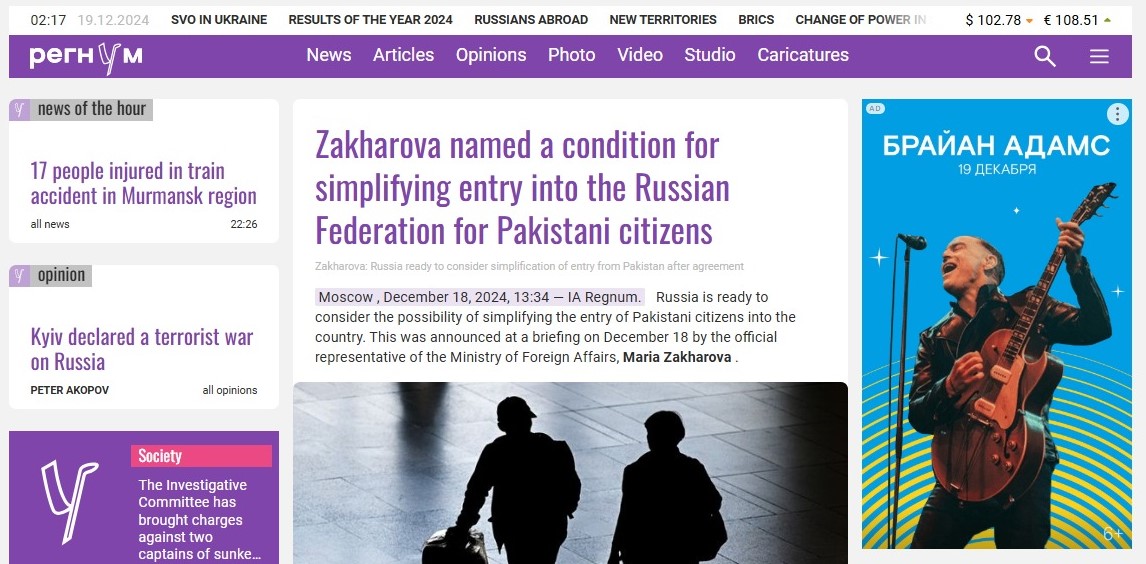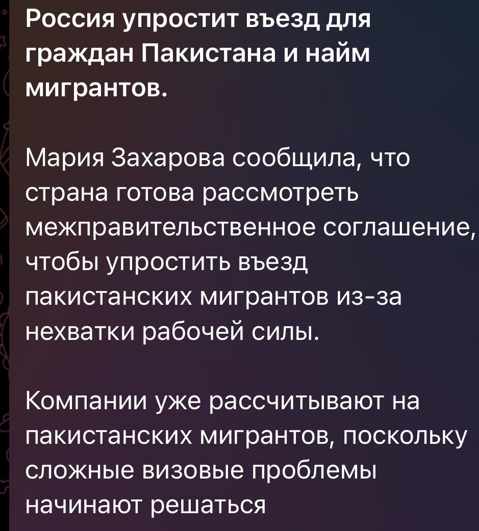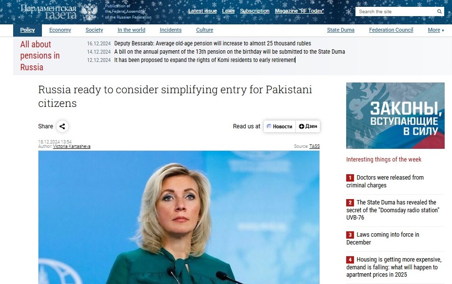 ماسکو ( وائس آف رشیا) روسی وزارت خارجہ کی ترجمان ماریہ زخارووا نے اپنی ہفتہ وار پریس بریفنگ میں شام، فلسطین اور یوکرین سمیت دیگر اہم ایشوز پر بریفنگ دی ،اس پریس بریفنگ میں پاکستانی صحافی و چیف ایڈیٹر ‘وائس آف رشیا’، نمائندہ 92نیوز شاہد گھمن نے ماریہ زخارووا سے سوال کیا کہ روس بھارتی شہریوں کو 2025میں ویزہ فری انٹری دینے جارہا ہے لیکن پاکستانیوں کو ویزہ ہونے کے باوجود ائیرپورٹس سے ہی ڈیپورٹ کیا جارہا ہے ۔
