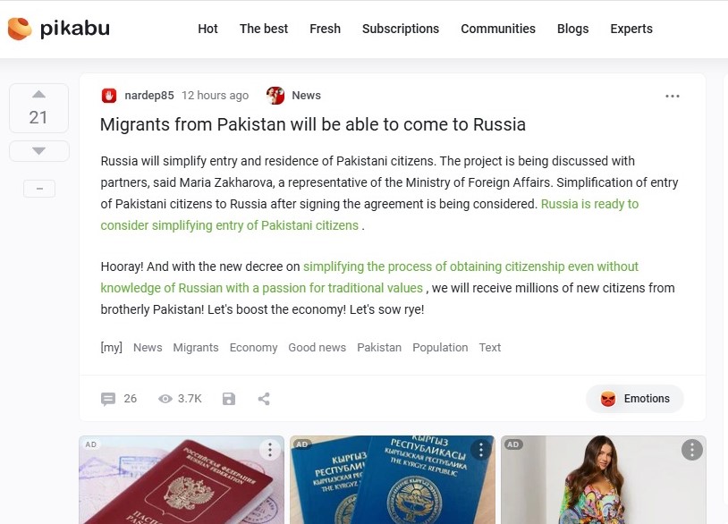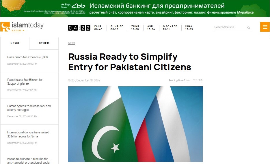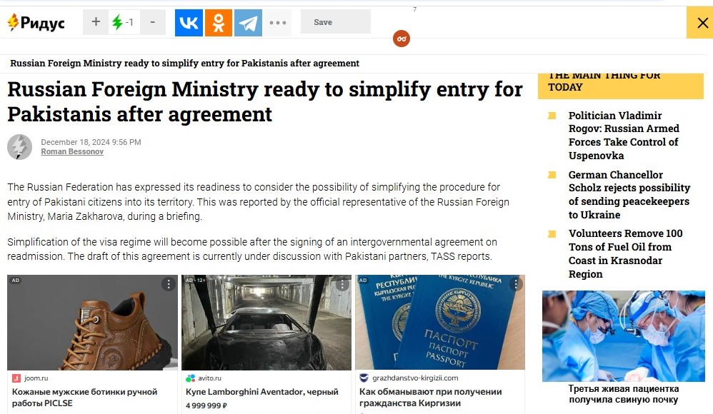 جس پران کا کہنا تھا کہ ہم پاکستانی شہریوں کے روس میں داخلے کو آسان بنانے کیلئے تیار ہیں۔جس کیلئے پاکستان کو روس کے ساتھ دوبارہ داخلے کے بین الحکومتی معاہدے پر دستخط کرنا ہوں گے،