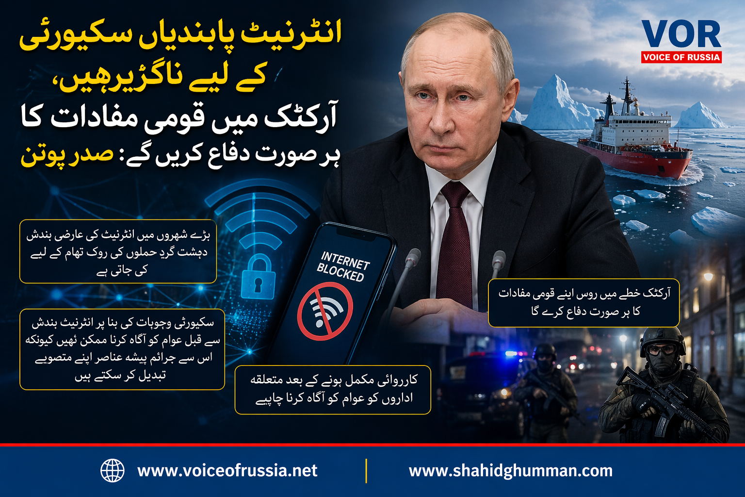 ماسکو(وائس آف رشیا) روسی صدر ولادیمیر پوتن نے کہا ہے کہ بڑے شہروں میں انٹرنیٹ کی عارضی بندش دہشت گرد حملوں کی روک تھام کے لیے کی جاتی ہے، جبکہ آرکٹک خطے میں روس اپنے قومی مفادات کا ہر صورت دفاع کرے گا۔