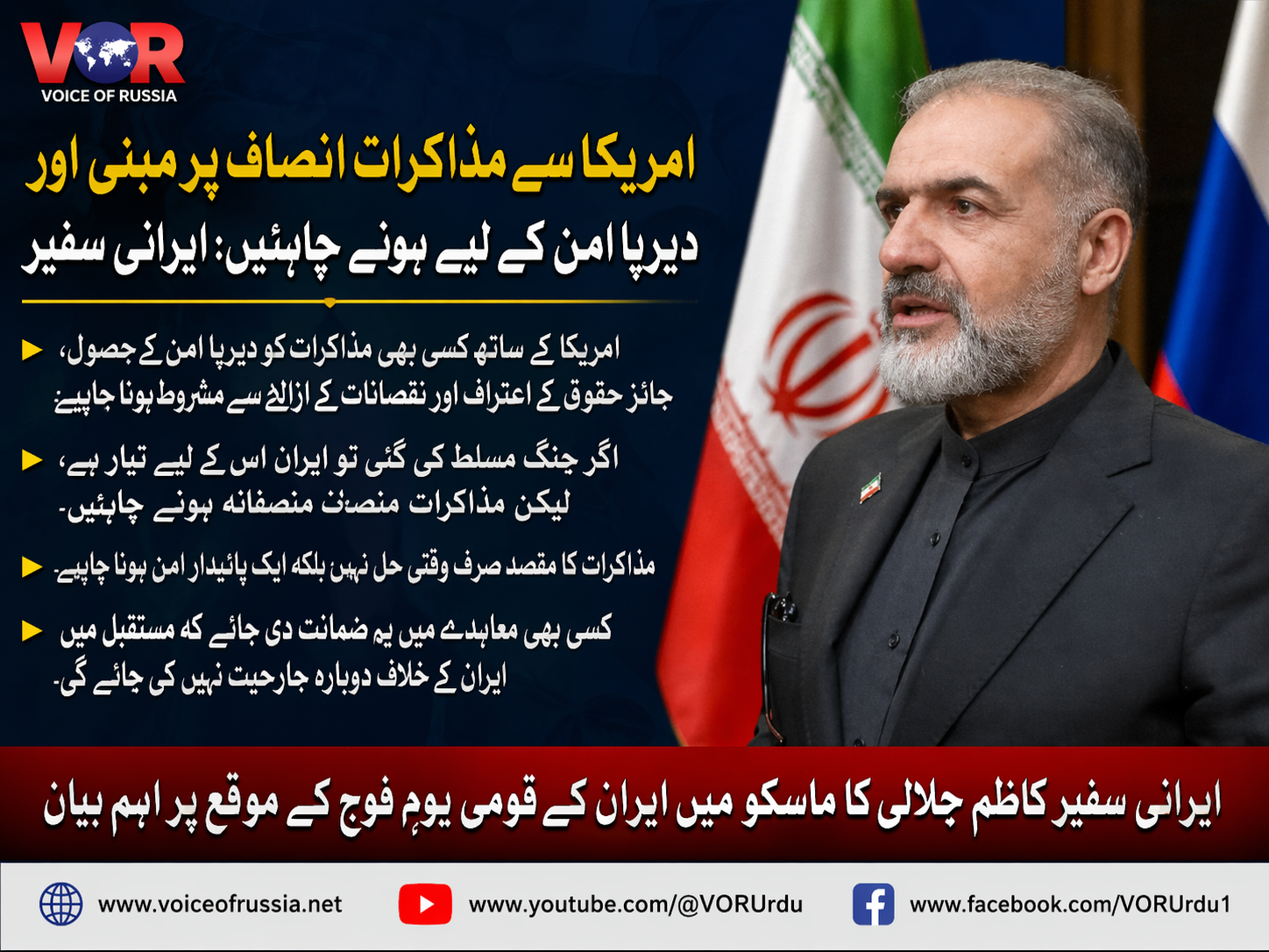 ماسکو(وائس آف رشیا) روس میں ایران کے سفیر کاظم جلالی نے کہا ہے کہ امریکا کے ساتھ کسی بھی ممکنہ مذاکرات کو دیرپا امن کے حصول، ایران کے جائز حقوق کے اعتراف، نقصانات کے ازالے اور مستقبل میں جارحیت نہ ہونے کی ضمانت سے مشروط ہونا چاہیے۔