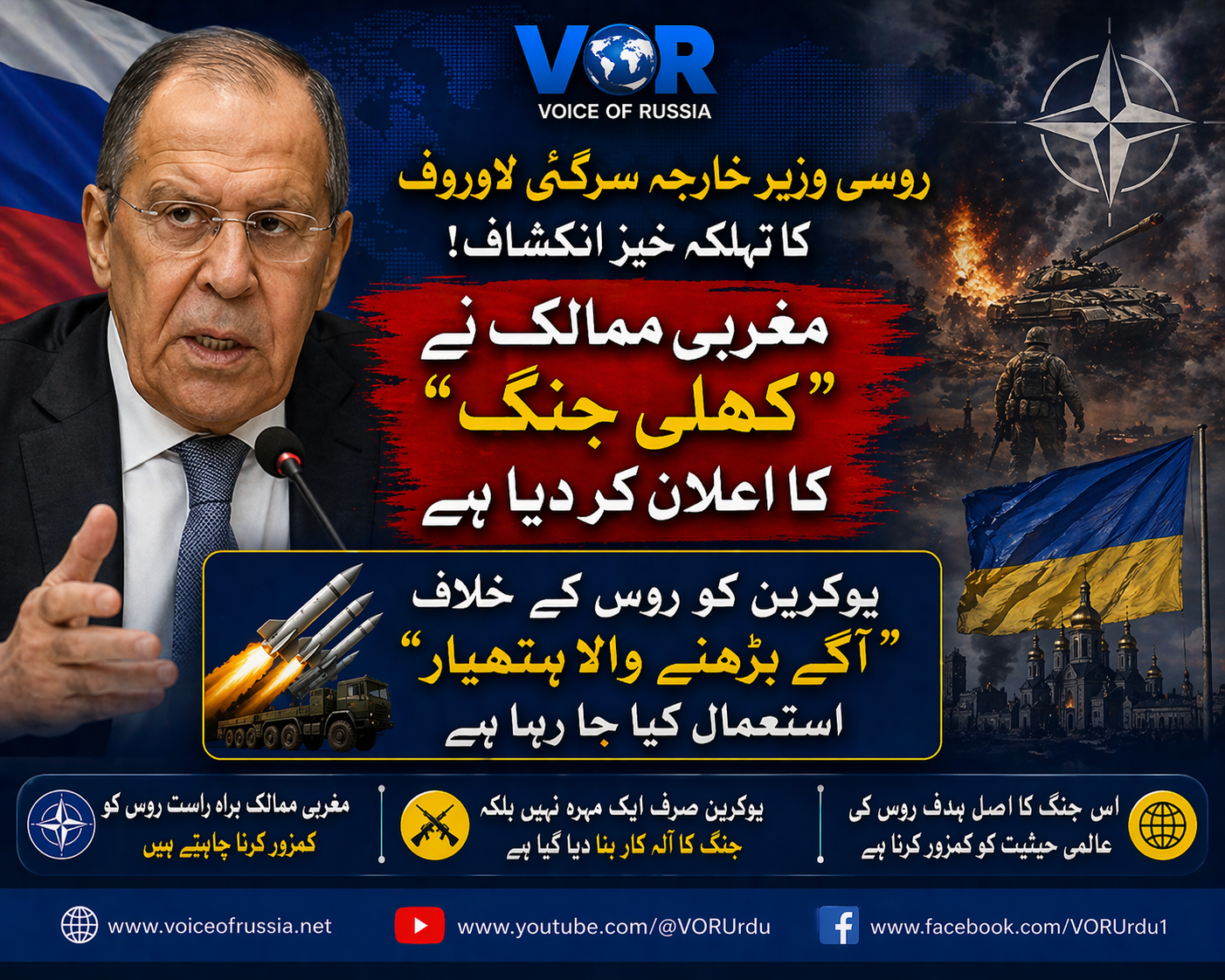 ماسکو(وائس آف رشیا) روس کے وزیر خارجہ سرگئی لاوروف نے کہا ہے کہ مغربی ممالک نے روس کے خلاف “کھلی جنگ” کا اعلان کر دیا ہے اور اس مقصد کے لیے یوکرین کو بطور “آگے بڑھنے والا ہتھیار” استعمال کیا جا رہا ہے۔