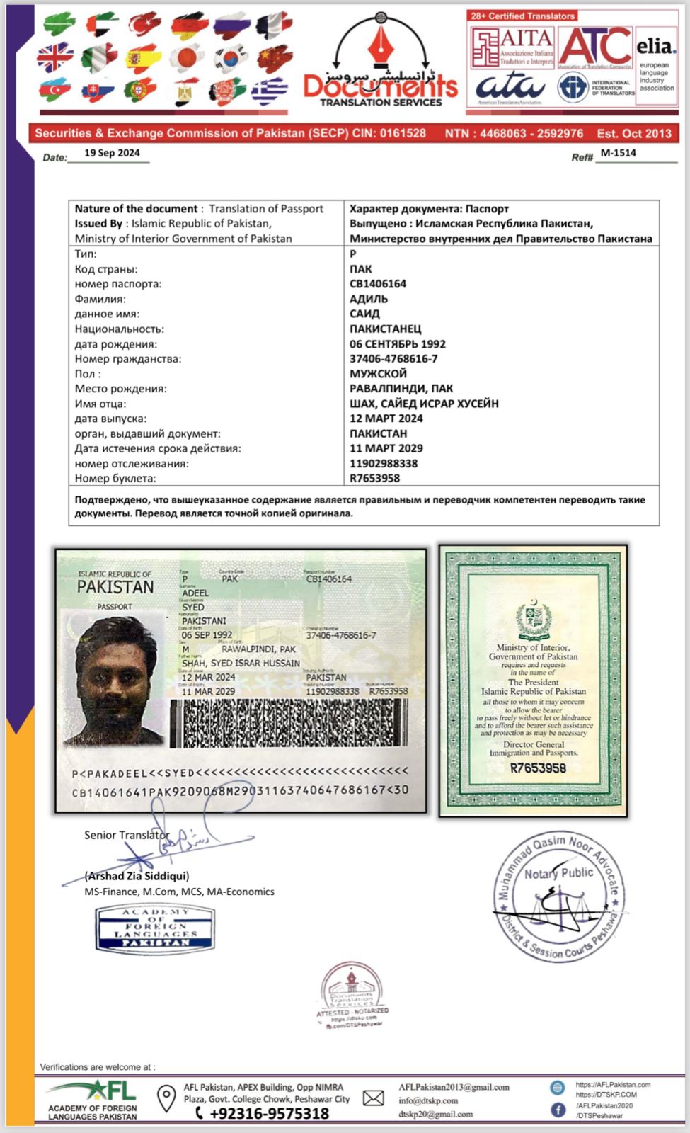 سفارتخانہ پاکستان ماسکو میت کو پاکستان بھجوانے کے انتظامات کر رہا ہے دو دن تک پوسٹمارٹم کے بعد میت پاکستان روانہ کرنے کے انتظامات مکمل کر لئے جائیں گے.