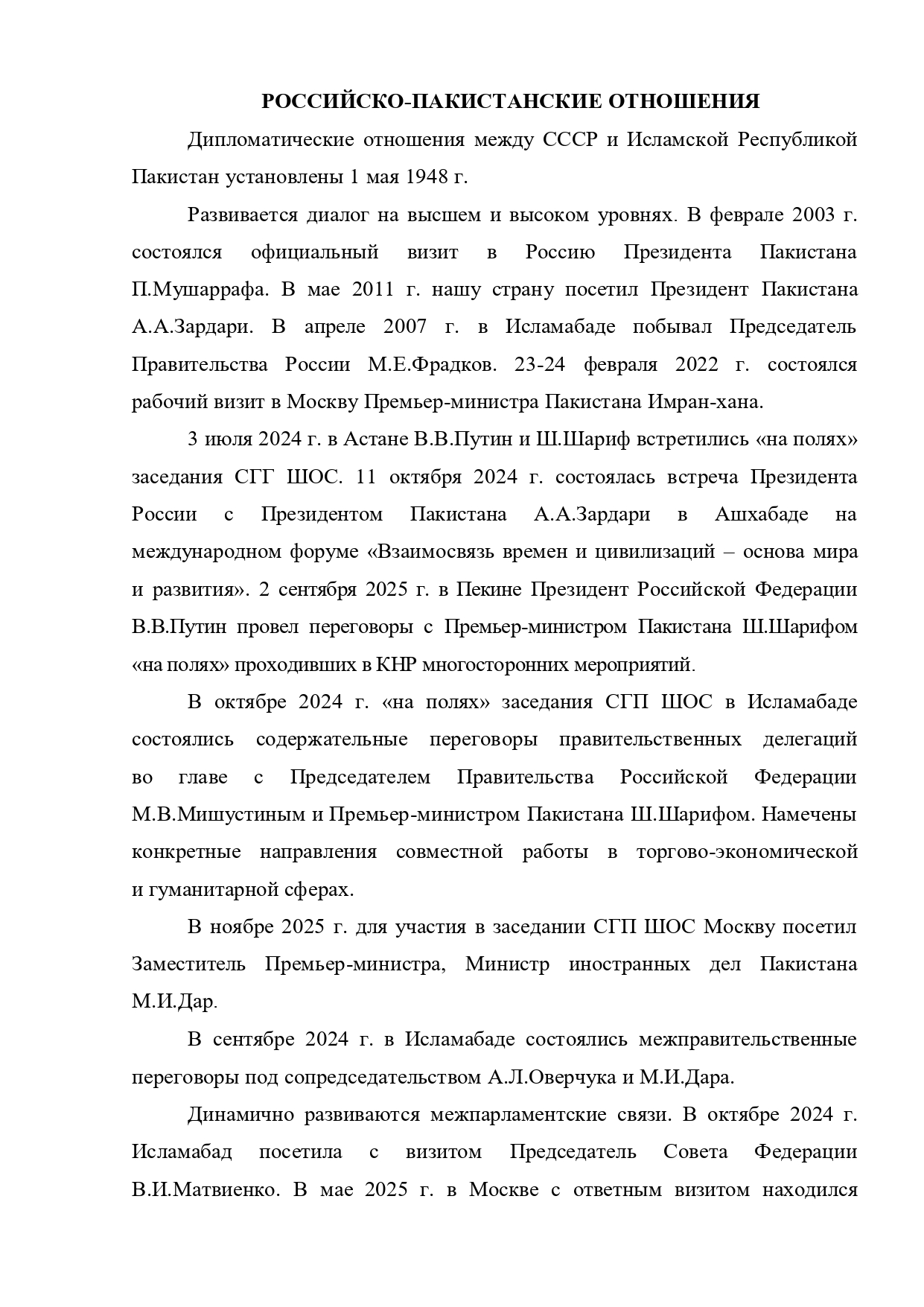 According to the Russian Foreign Ministry, diplomatic relations between the Soviet Union and the Islamic Republic of Pakistan were established on May 1, 1948. High-level and top-level contacts between the two countries have continued consistently.